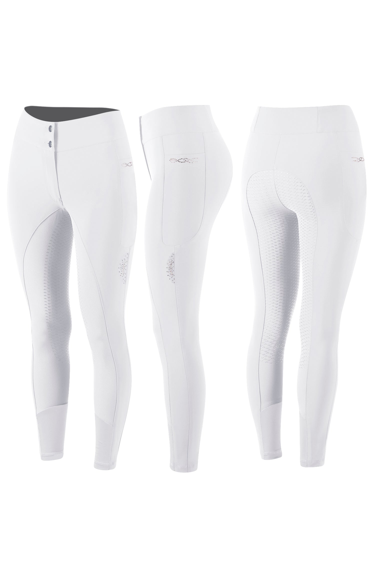 Beautiful riding breeches from the Animo winter collection. This riding breeches has a high waist and a full silicone seat. The riding breeches is finished with rhinestones on the back pockets and on the left leg.