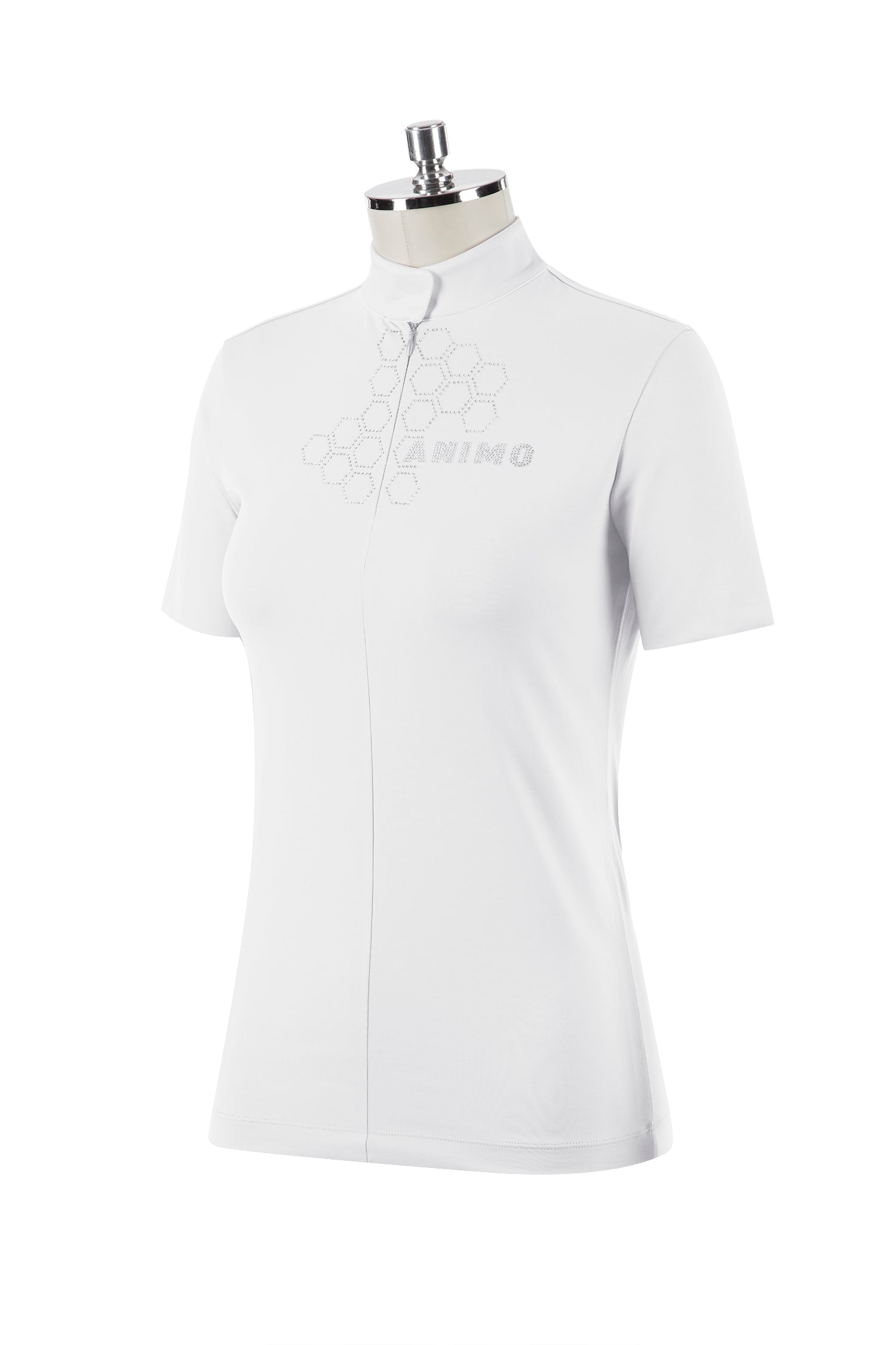 Blanco - the short-sleeved women's competition shirt from Animo's spring/summer 2023 collection is made of popular jersey material and is particularly durable and easy-care. In addition, it has breathable and quick-drying properties for a high level of comfort. A white stand-up collar, a concealed zip and the subtle rhinestone applications in a honeycomb design give the shirt an elegant and sporty look. This tournament shirt is tailored by Animo directly in Italy.
