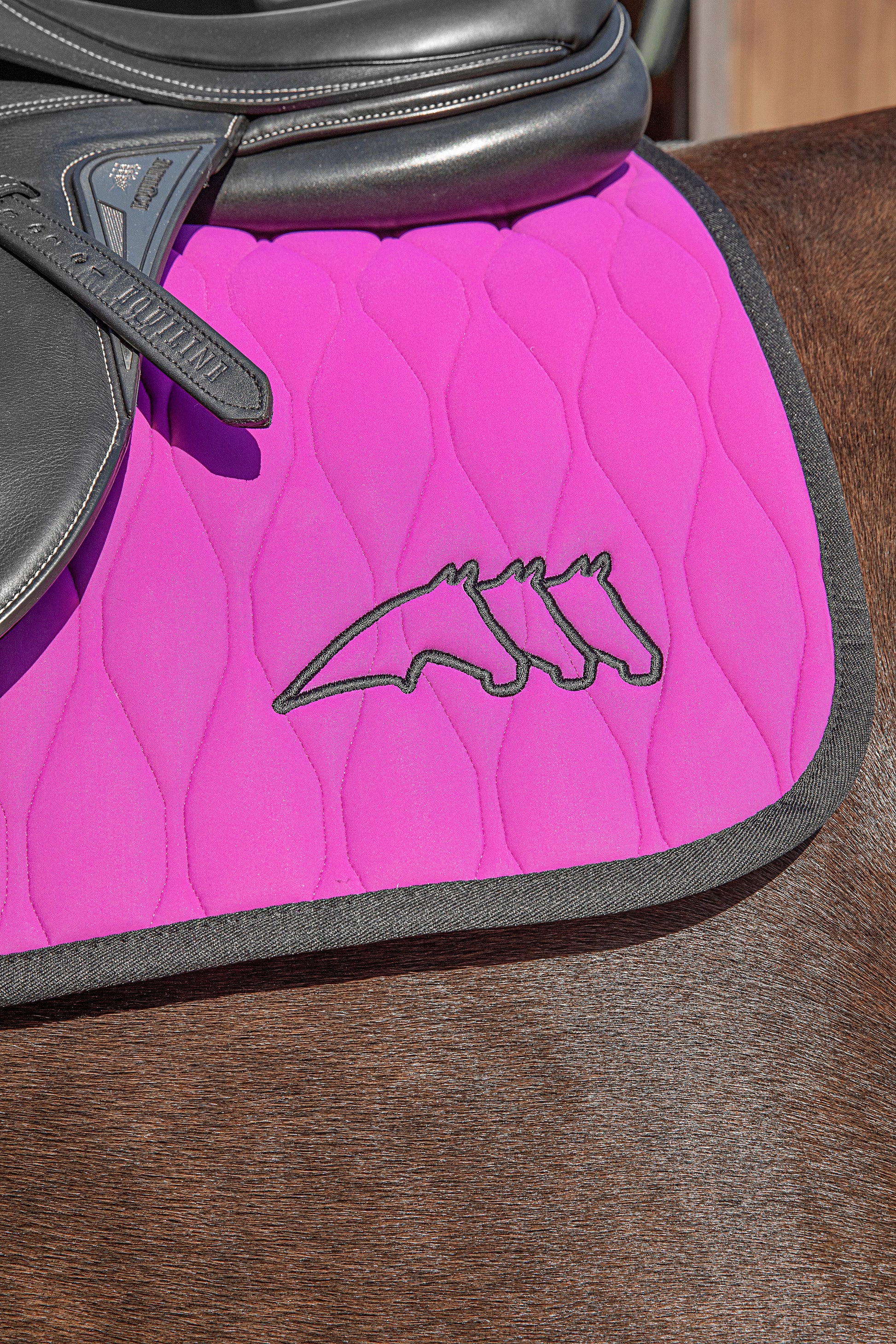 Chic saddle pad from the Equiline summer collection. This pad is made of soft and breathable fabric. The pad is finished with contrasting piping and an Equiline logo.