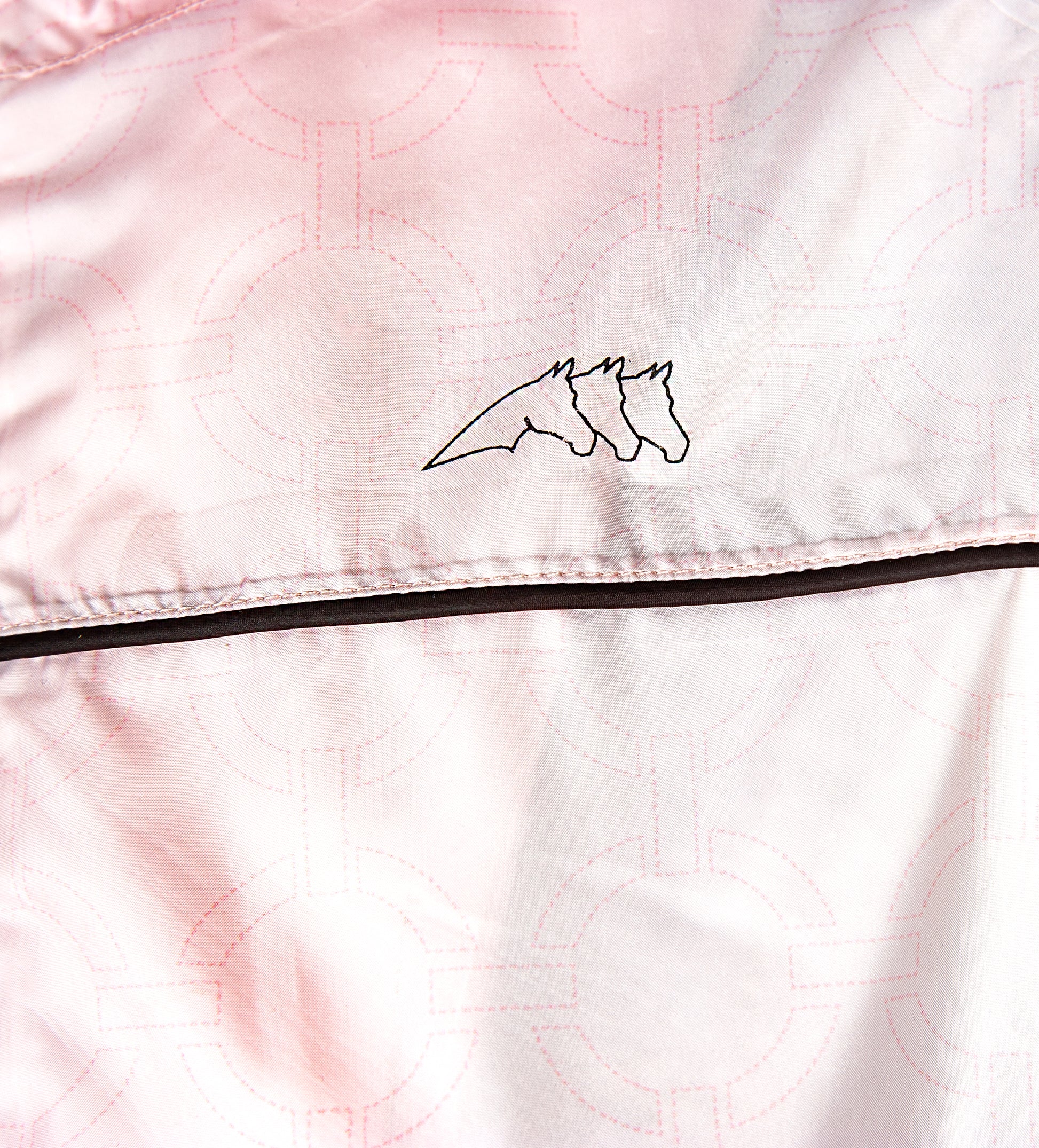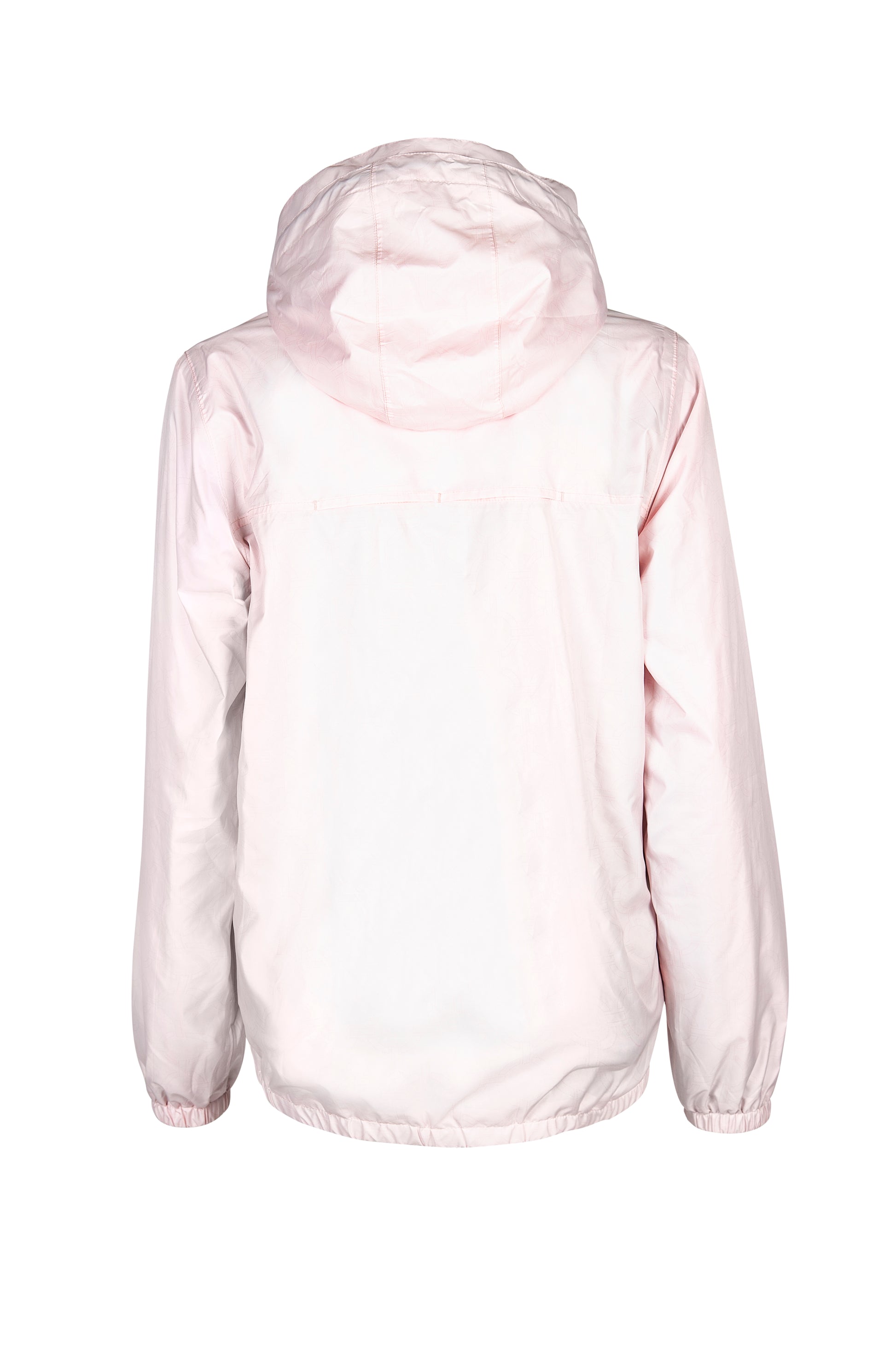 Sporty and functional ladies jacket with attached hood - breathable, water repellent and wind repellent, with taped seams. In the color pink with fashionable all-over-print, in the color cookie plain. With fashionable contrast-pipings at the front at the breast and the sleeves. With concealed zipper side pockets and contrast-elastic-cord at the hood. With Equiline-icon-labelling on the left chest.