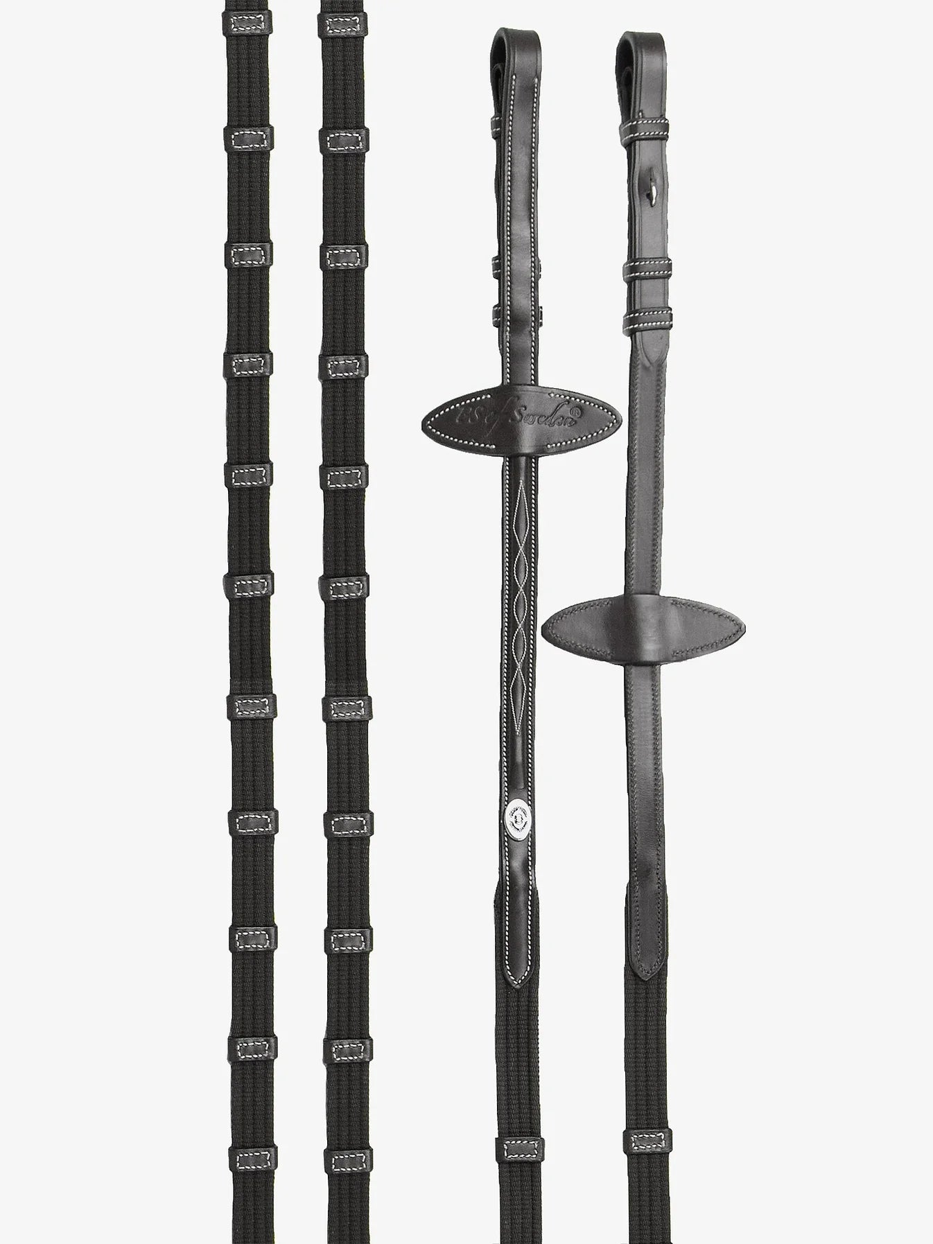 This web rein is slightly wider, with helpful leather stops and elastic Cradles. The elastic Cradles gives a resilient effect in the horse's mouth leading to a more pleasant experience and softer contact.