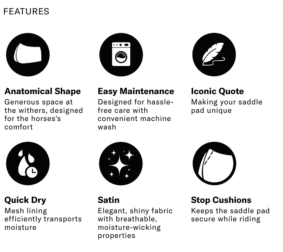 With an anatomically shaped design, the Signature saddle pad provides extra space for the withers, promoting the horse's freedom of movement. Made from the finest satin, it features a Quick Dry lining that effectively wicks away moisture and sweat, allowing it to dry quickly after use. For enhanced stability, it is equipped with shock-absorbing padding and stop cushions to prevent slipping.
