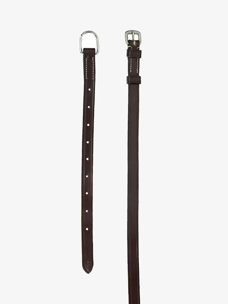 A separate throat latch with silver buckles that you attach to our Click It™ browbands. The latch has D-ring hooks for the Click It™ browband, which you then attach to the bridle. English vegetable tanned leather.