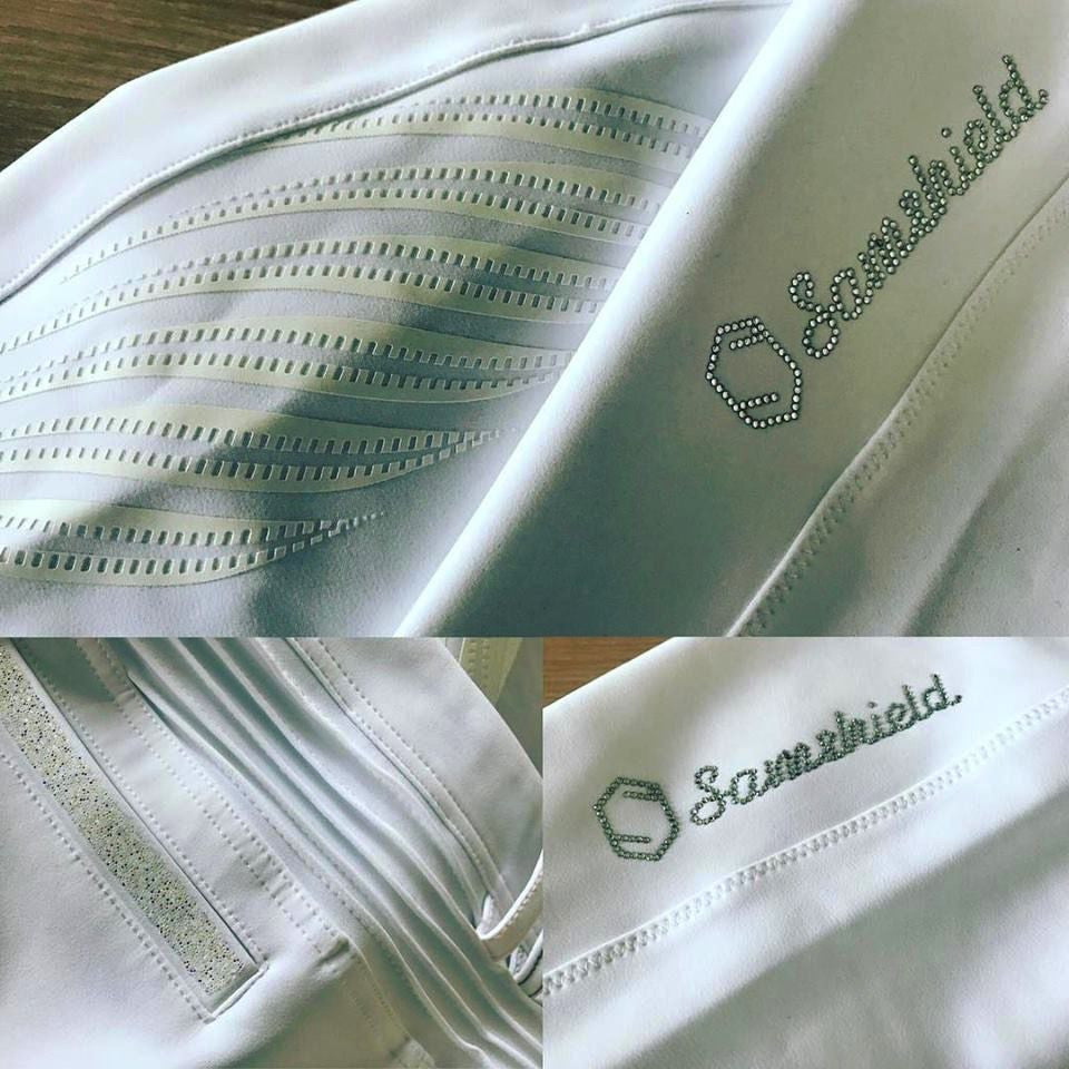 The Adèle breeches provide comfort and technical performance to riders. The tailored design, using wearability resistant high stretch fabric along with the pleats on the back ensure a perfect fit for the rider. The Adèle breeches offer a second skin effect for optimal comfort. The elasticated fabric guarantees high breathability and wind protection. The silicone knee grip ensures stability and adherence in the saddle. The compression fabric offers a perfect fit of the breeches. The elastic tape inside the belt is equipped with silicone which prevents the shirt from rising. Thanks to the special construction of the fabric the Adèle breeches offer protection against ultraviolet rays. The breeches are embellished with a Swarovski® Samshield logo on the rider’s thigh and Crystal Fabric Swarovski® on the back pockets combining technical performance and elegance.