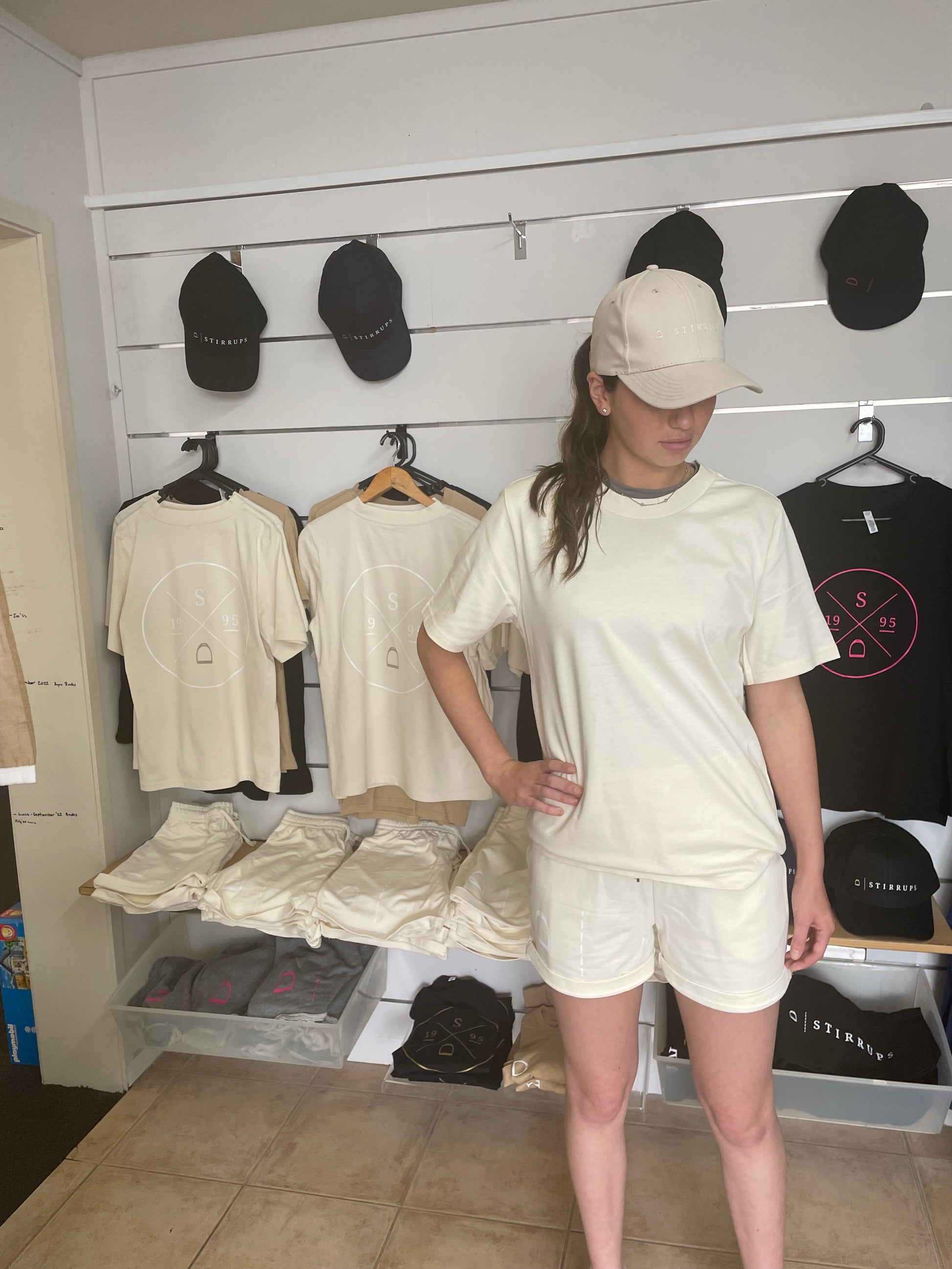 This Stirrups Equestrian Merch t-shirt offers a comfortable and durable piece of apparel. Its butter beige color and crisp white logo make a classic statement. Heavy cotton ensures a striking look and feel that is sure to last.